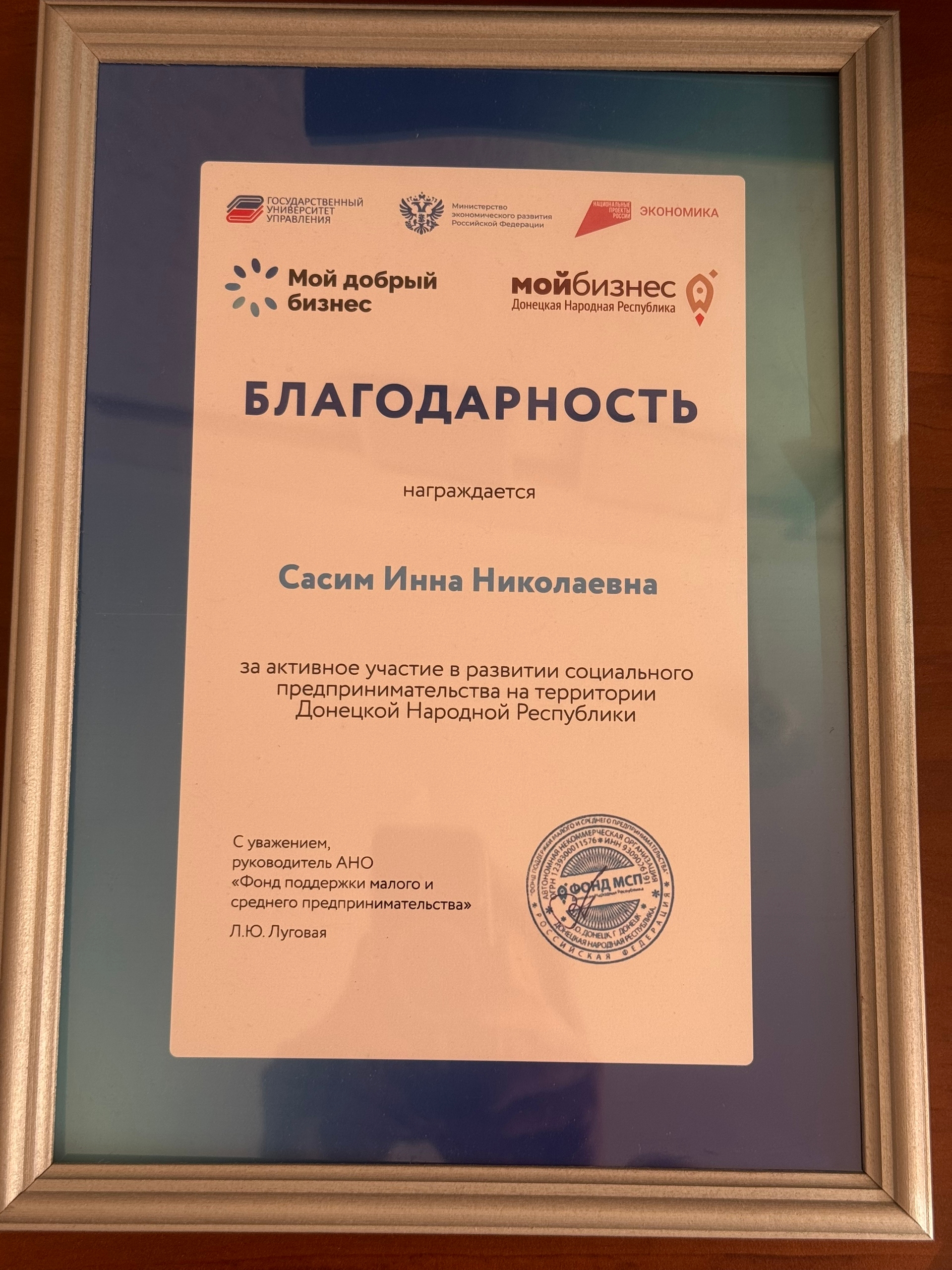 В ходе мероприятия моя деятельность была отмечена Благодарностью руководителя АНО "Фонд поддержки малого и среднего предпринимательства", а также Центра "Мой бизнес" (ДНР) Любови Юрьевны Луговой за активное участие в развитии социального предпринимательства на территории ДНР.
