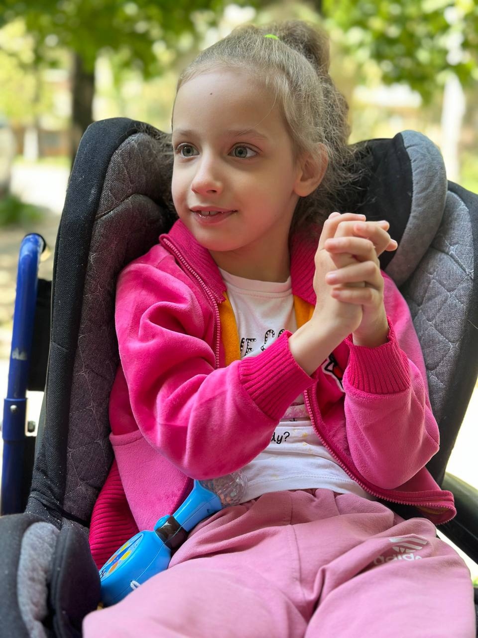 Настя рождена в 30 недель в результате экстренного кесарево сечения. Вследствие недоношенности и нарушения внутриутробного кровотока у ребенка с рождения повышен тонус мышц, а также имеются ограничения в работе конечностей. Настя очень веселая девочка, любит играть с игрушками, рассматривать книжки и смотреть мультфильмы, однако из-за серьезных проблем со здоровьем ребенок не ходит и не сидит.